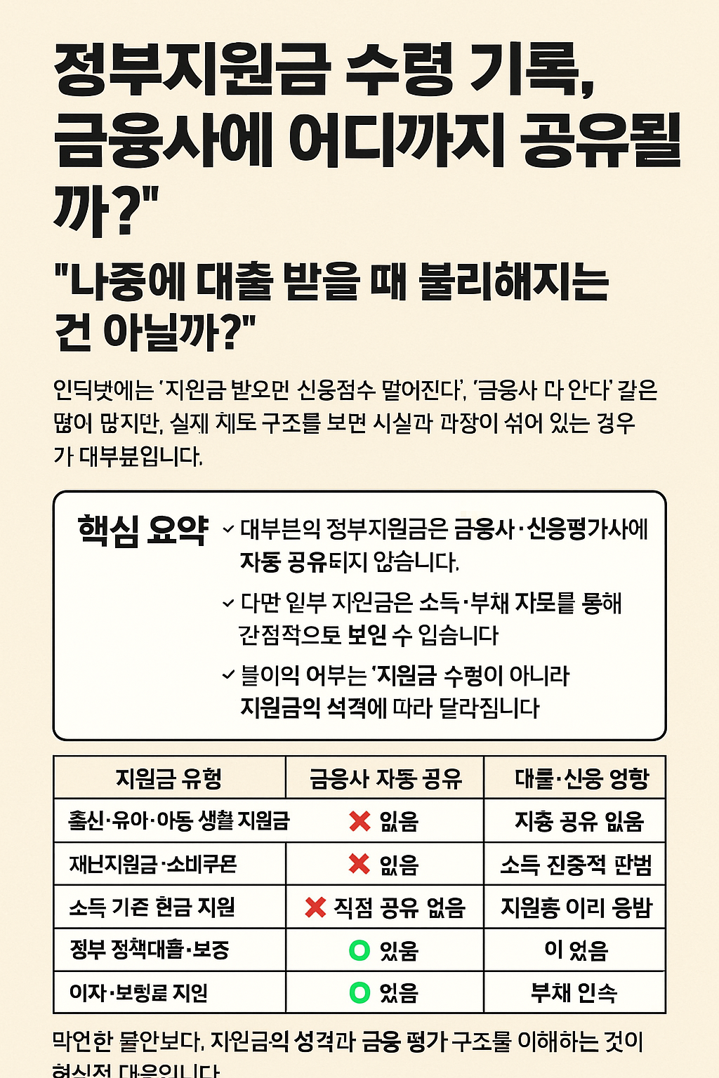 막연한 불안보다, 지원금의 성격과 금융 평가 구조를 이해하는 것이 훨씬 현실적인 대응입니다.